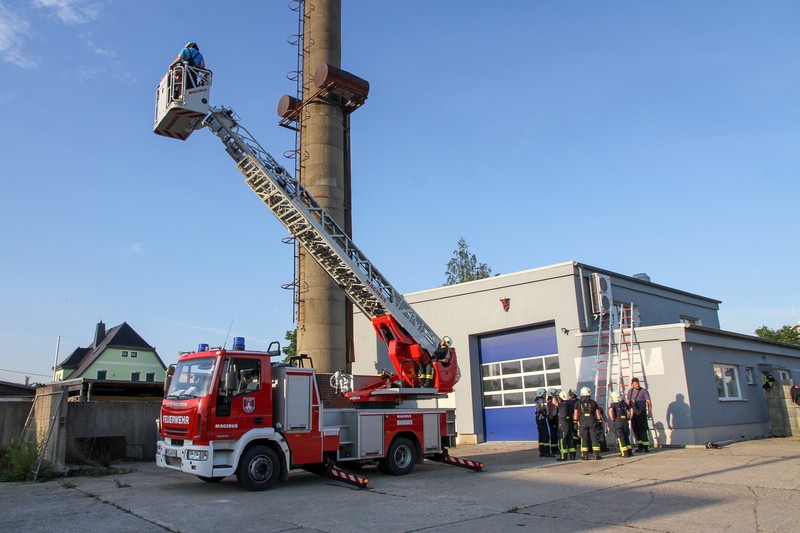 Unter der Leitung von Michael Tag übten die Einsatzkräfte den sicheren Einsatz von Steckleitern und trainierten die Rettung einer verunfallten Person von einer Dachfläche. Mario Rumberger hatte zudem die Drehleiter der Naunhofer Feuerwehr nach Klinga geholt. Unter seiner Leitung vertieften die Feuerwehrleute die Einsatzmöglichkeiten des Fahrzeugs und übten die Steuerung des Drehleiterkorbes.