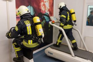Dort absolvierten sie ihr vorgeschriebenes Belastungstraining. Dazu gehörten neben dem Training auf dem Laufband, der Leiter und dem Fahrrad auch das Absolvieren des Übungsparcours – natürlich alles unter persönlicher Schutzausrüstung.
