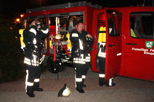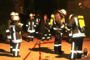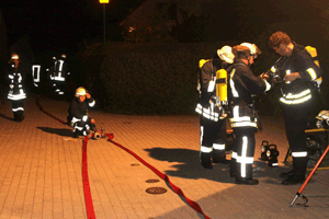Nach Erkundung und Ausleuchtung der Einsatzstelle bauten die Kameraden eine lange Wegstrecke zur Löschwasserversorgung aus dem nahegelegenen Regenrückhaltebecken auf. Anschließend rückten sie unter Atemschutz in den Keller vor, wo sie den fiktiven Brand löschten, die Propangasflasche kühlten und bargen.