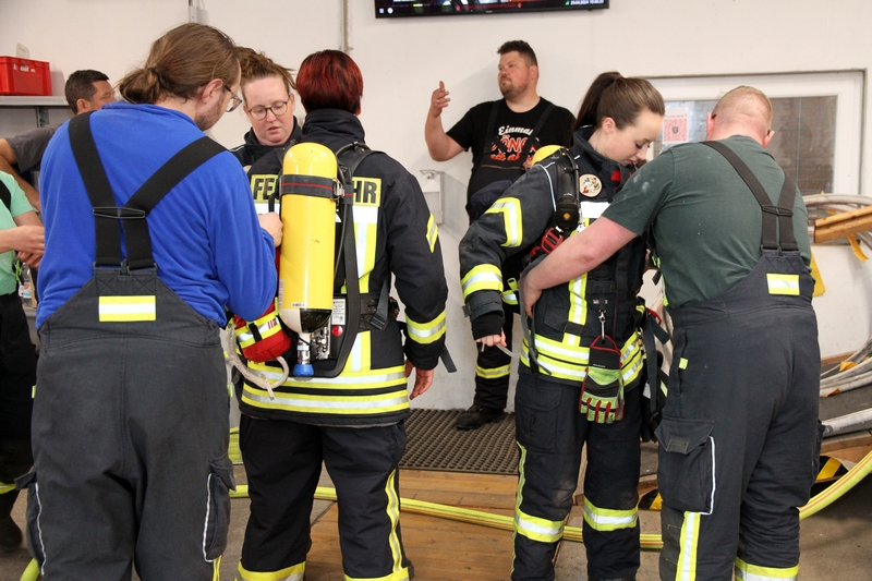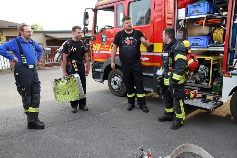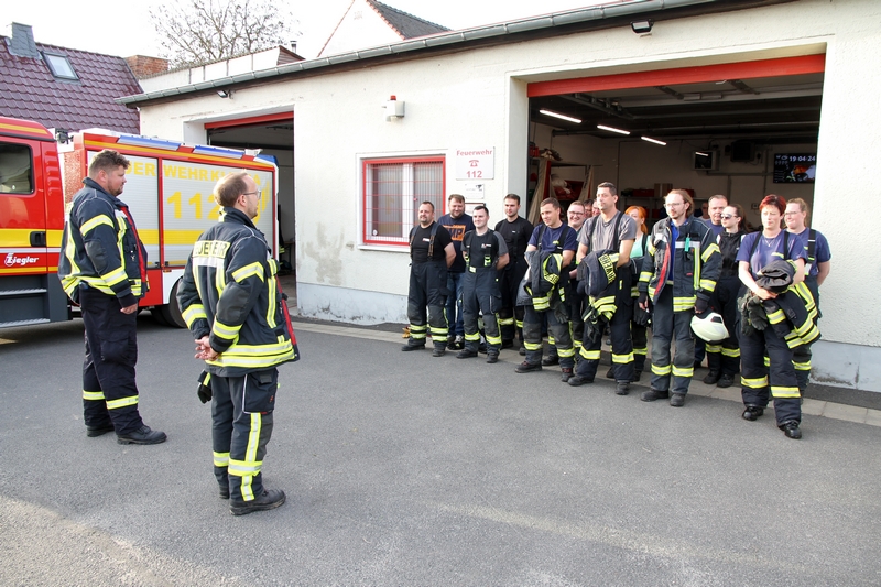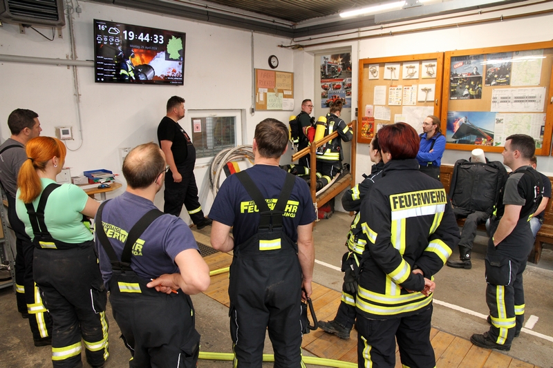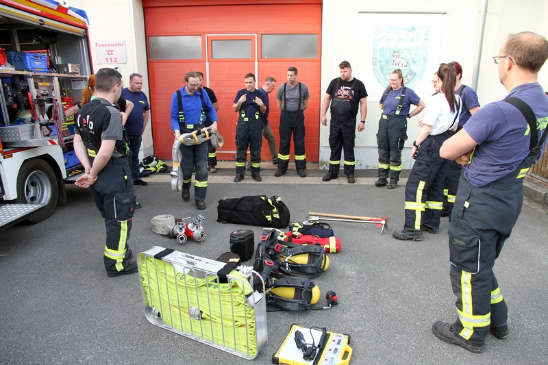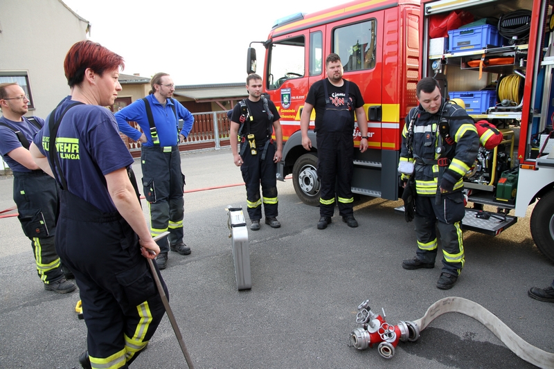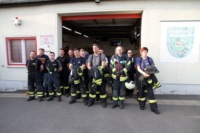 Beim sogenannten Innenangriff werden die Feuerwehreinsatzkräfte mit besonderen Herausforderungen und spezifischen Gefahren konfrontiert. Das Vorgehen dabei konnten die Klingaer Feuerwehrfrauen und -männer heute unter erleichterten Bedingungen erlernen oder vertiefen. Michael Tag formierte dazu wechselnde Angriffstrupps, die sich unter anderem den Schwerpunkten Schlauchmanagement, Türprozedur, Absuchen von Brandräumen und dem Löschen des Brandes selbst widmeten. Während ein Teil der Einsatzkräfte das Vorgehen unter seiner Anleitung praktisch erprobte, konnten die anderen Beteiligten mit Augen und Ohren mitlernen.