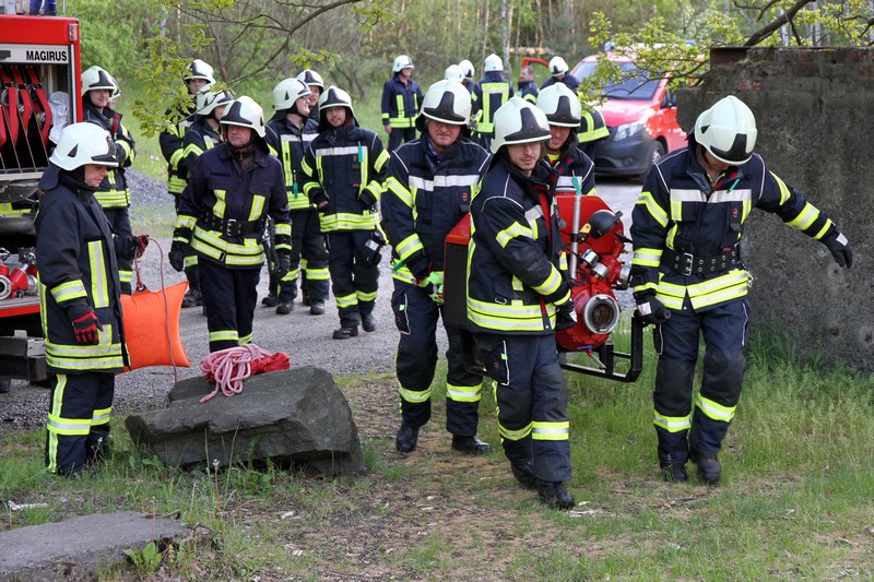 Dazu rückten die Einsatzkräfte gemeinsam nach Ammelshain an den Haselberg aus. In drei Gruppen trainierten sie hier unter der Leitung von Michael Pohl die Wasserentnahme aus offenen Gewässern bei großem Höhenunterschied, bei Ronny Richter den Löschangriff sowie bei Mario Rumberger den korrekten Funksprechverkehr.