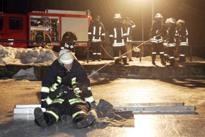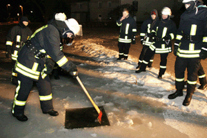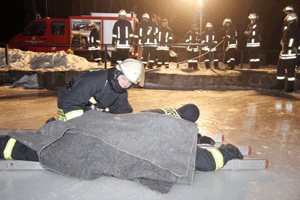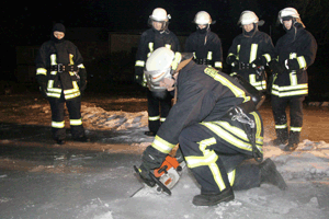 Die Eisrettung und die Vorbereitung der Löschwasserentnahme an zugefrorenen Gewässern trainierten Klingas Feuerwehrleute am Dorfteich.