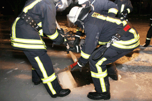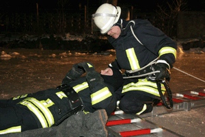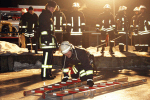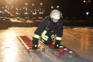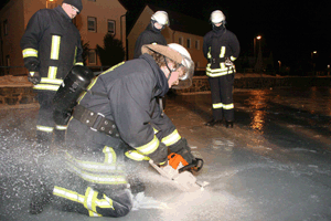 Gut 25 Zentimeter dick präsentierte sich das Eis auf dem Klingaer Dorfteich – ideale Bedingungen für das Training der Eisrettung mit Bordmitteln des TSF-W. Auf Steckleitern und mit Seilen gesichert arbeiteten sich so die Kameraden zur verunglückten Person vor, um sie in Sicherheit zu bringen. Zudem wurde der Einsatz der Kettensäge im Eis zur Sicherstellung der Löschwasserversorgung auch unter winterlichen Bedingungen trainiert.