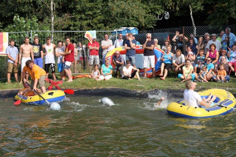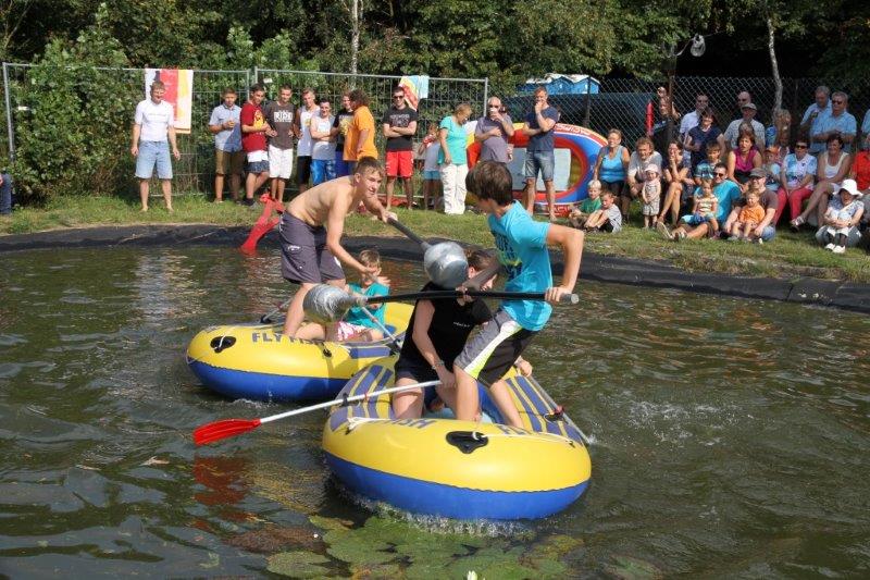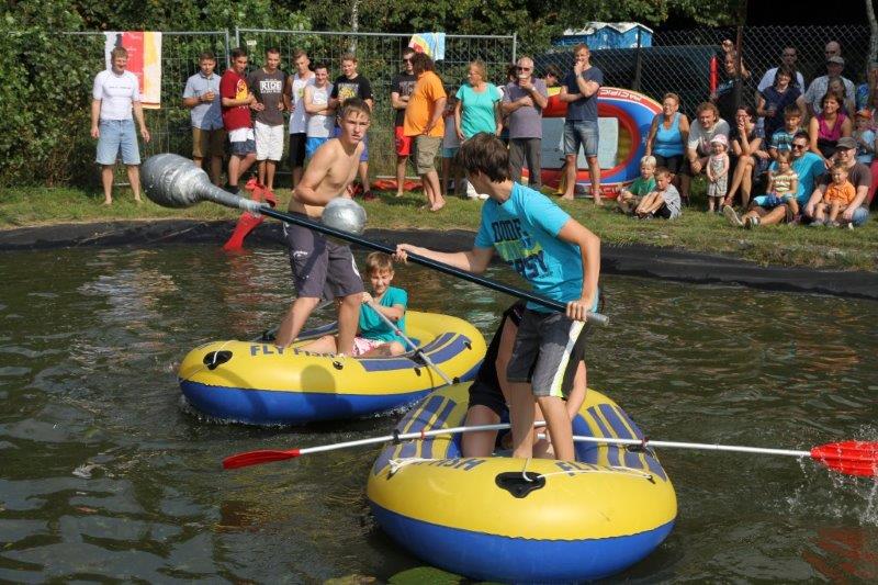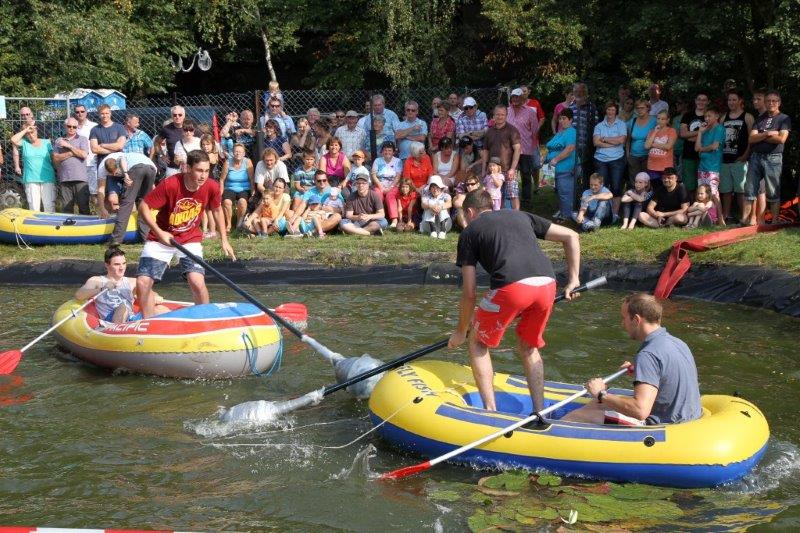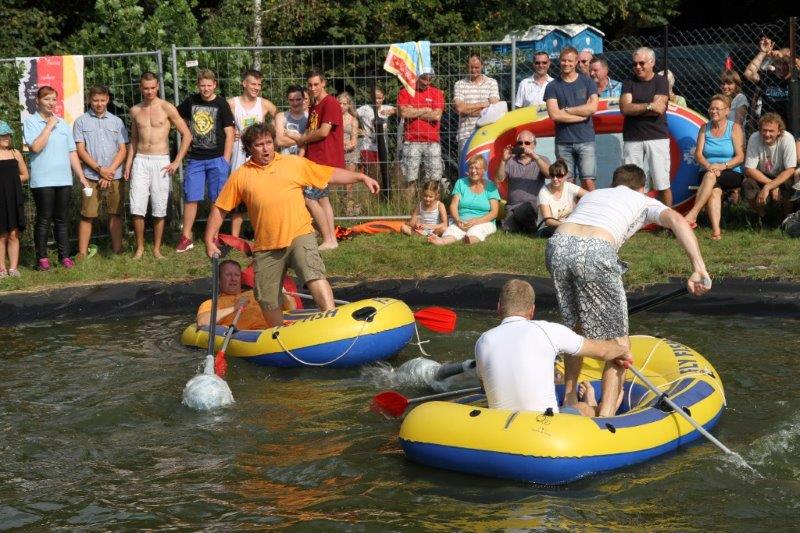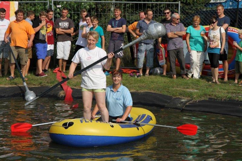 Insgesamt zehn Teams gingen an den Start, um in den wackligen Schlauchbooten Standfestigkeit und taktisches Geschick zu beweisen. Konnten die „Dream Girls“ im Ladys-Cup ihren Pokal und die Magnum-Flasche wieder einmal kampflos entgegennehmen, maßen im Junior-Cup schon zwei Teams ihre Kräfte. Das Team „easy go“ machte seinem Namen alle Ehre und wurde von den „Luebeckern“ rasch ins Wasser geschickt. Der Erfolg verlieh dem Junior-Team offenbar Flügel, denn es kämpfte sich anschließend in der Gesamtwertung bis ins Finale und errang einen völlig verdienten zweiten Platz. Nur das Wettkampf-erprobte Team der „Vertreter der Siedlung“ blieb gegen die acht Konkurrenten standhaft und sprang am Ende allein freiwillig in die Fluten des Feuerlöschteichs. Hier die Platzierten: