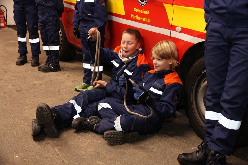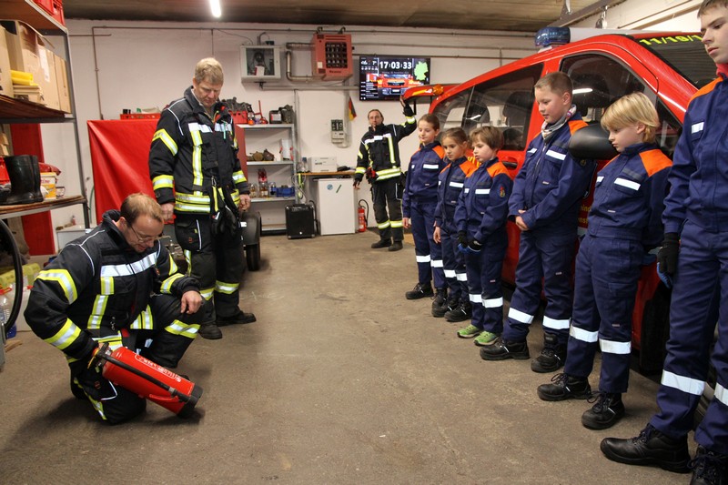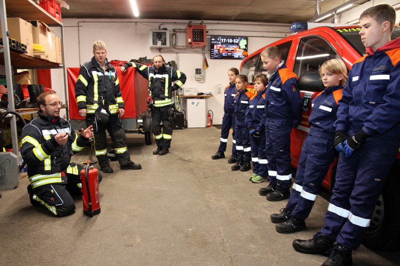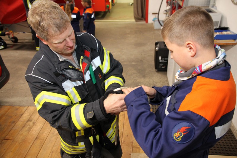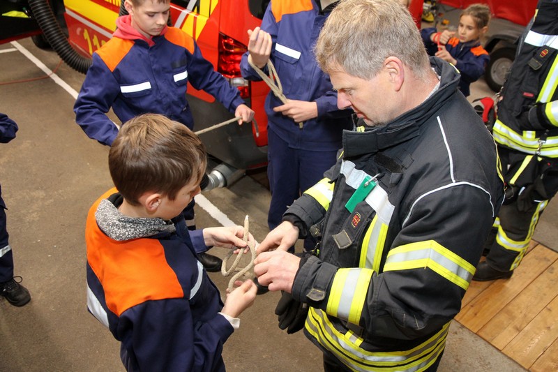 Unter der Leitung von Steffen Schumann, Ronny Richter und Peter Baudisch machten sich die Mädchen und Jungen mit verschiedenen Brandklassen und Löschmöglichkeiten bei Entstehungsbränden vertraut. In naher Zukunft soll auch der praktische Einsatz von Feuerlöschern geübt werden. Zunächst stand aber noch einmal das Üben von Feuerwehrknoten auf dem Plan.