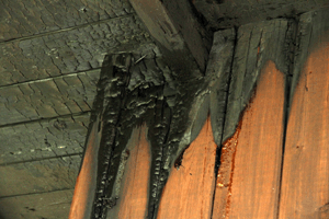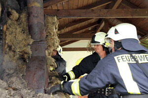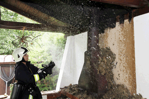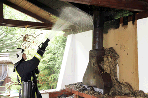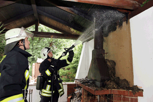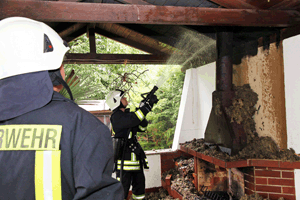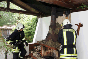 Nach der Erkundung und Sicherung der Einsatzstelle entfernten die Klingaer Feuerwehrleute die Holzverkleidung sowie die darunter liegende Isolierung des Gartenkamin-Abzugs und löschten potentielle Glutnester per Schnellangriff ab.