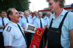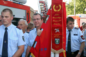 Mit einem Fahnenwimpel gratulierten die Klingaer Feuerwehrleute den Kameraden der Freiwilligen Feuerwehr Pomßen zum 70. Gründungsjubiläum.
