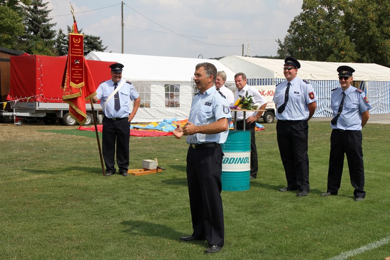 Spätestens seit dem feuerwehrroten Fahrzeug-Corso mit Einsatzfahrzeugen aus der ganzen Region weiß jeder Großsteinberger, dass „seine“ Feuerwehr heute feiert. Auch beim anschließenden Festappell auf dem Sportplatz reihten sich Klingas Feuerwehrleute und ihr Förderverein in die Schar der Gratulanten sein.