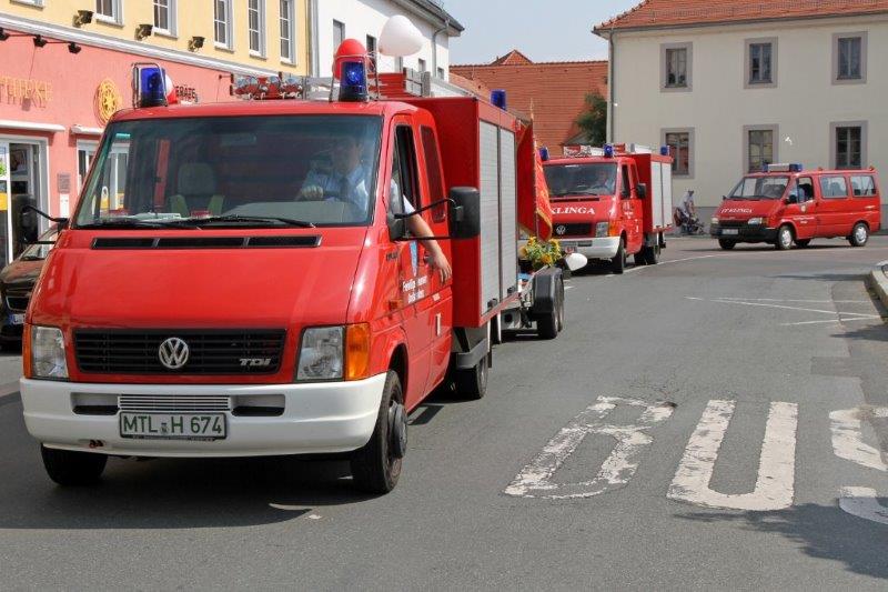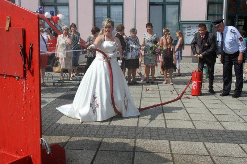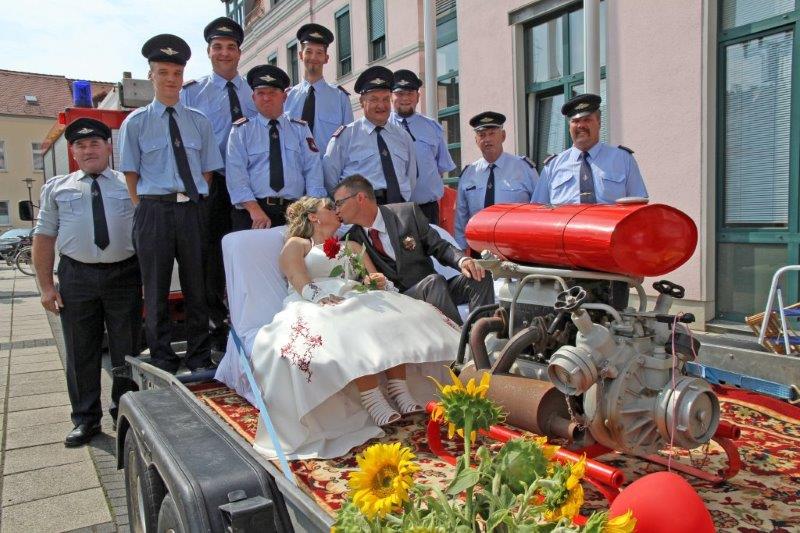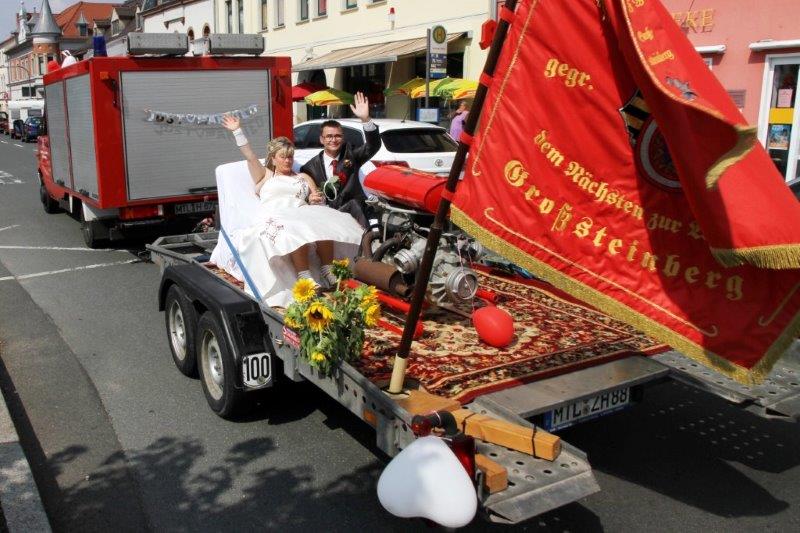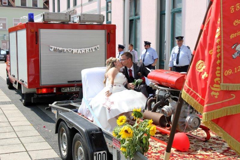 Am 10. August gaben sich im Naunhofer Standesamt Feuerwehrfrau Ines Ubl und Großsteinbergs Ortswehrleiter Hartmut Gnauck das Eheversprechen. Die Großsteinberger, Klingaer und Naunhofer Feuerwehrleute empfingen das frisch vermählte Paar beim Verlassen des Rathauses gebührend: Nach dem Durchschreiten der Schlauchbögen galt es für das traute Paar, an der Kübelspritze gemeinsam den ersten ehelichen Löscheinsatz zu meistern. Ihre Überraschung perfekt aber machten die Feuerwehrleute, als sie das Brautpaar auf einem Sofa Platz nehmen ließen und auf einem Anhänger per Feuerwehr-Korso samt Blaulicht und Martinshorn spektakulär einige Runden um den Naunhofer Marktplatz fuhren. Anschließend begleiteten die Einsatzfahrzeuge die Eheleute auf dem Heimweg nach Großsteinberg.