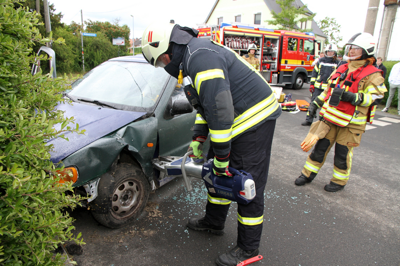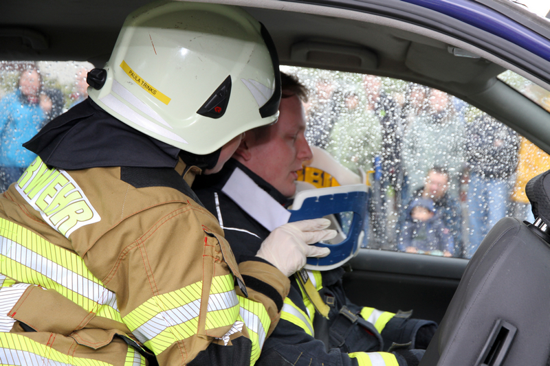 Kaffee, Eis und selbstgebackene Kuchen boten im Anschluss leckere Stärkung, Fotowände bildhafte Eindrücke der Arbeit von Feuerwehr und Förderverein. Der Nachwuchs tobte auf der Hüpfburg, ließ sich fantasievoll Schminken, löschte mit der Kübelspritze oder durfte auf dem Einsatzfahrzeug mitfahren. Plötzlich schrillte die Sirene: Auf der Kreuzung hatte es einen Pkw-Unfall gegeben. In diesem Übungsszenario zeigte die Einsatzabteilung ihr Können und rettete eine verletzte Person. Musik, Deftiges vom Grill und Kühles aus dem Zapfhahn sorgten anschließend für einen entspannten Abend mit vielen anregenden Gesprächen.