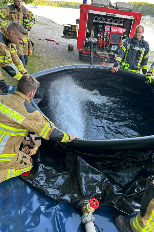 Auf dem Ausbildungsplan stand die Wasserentnahme aus offenen Gewässern. Bei dieser Gelegenheit wurde auch der neue Falttank der Großsteinberger Feuerwehr erprobt. Dieser fasst 5.000 Liter Wasser und kann im Einsatz zum Zwischenspeichern von Löschwasser und Schaffen einer Löschwasserreserve genutzt werden.