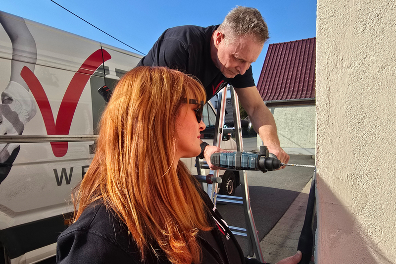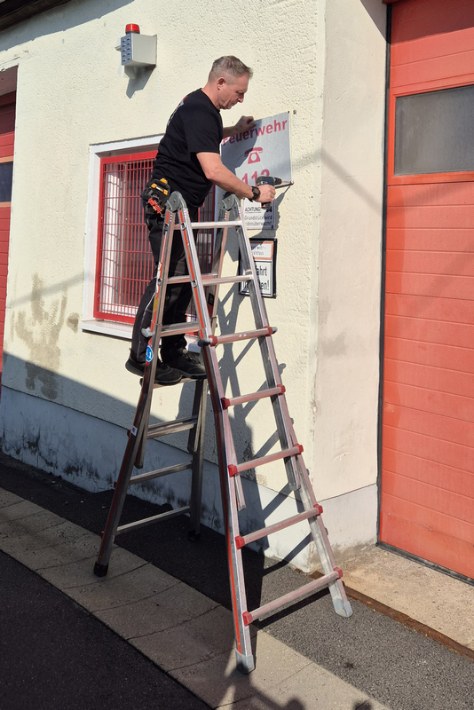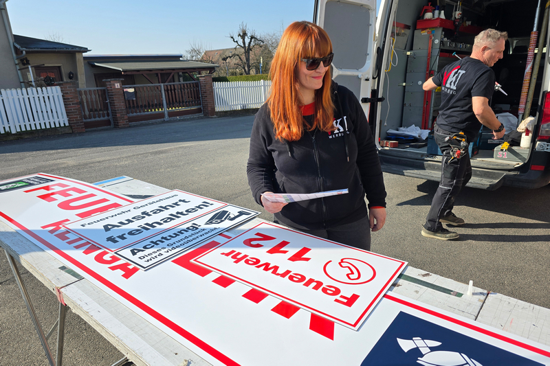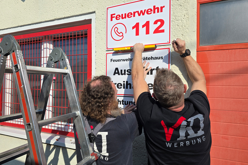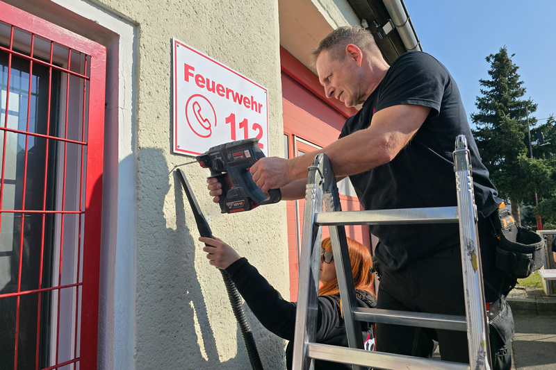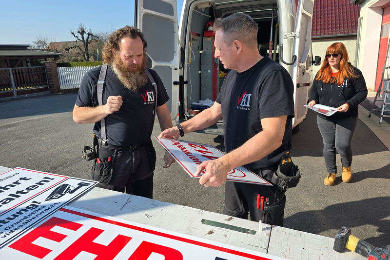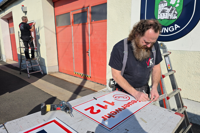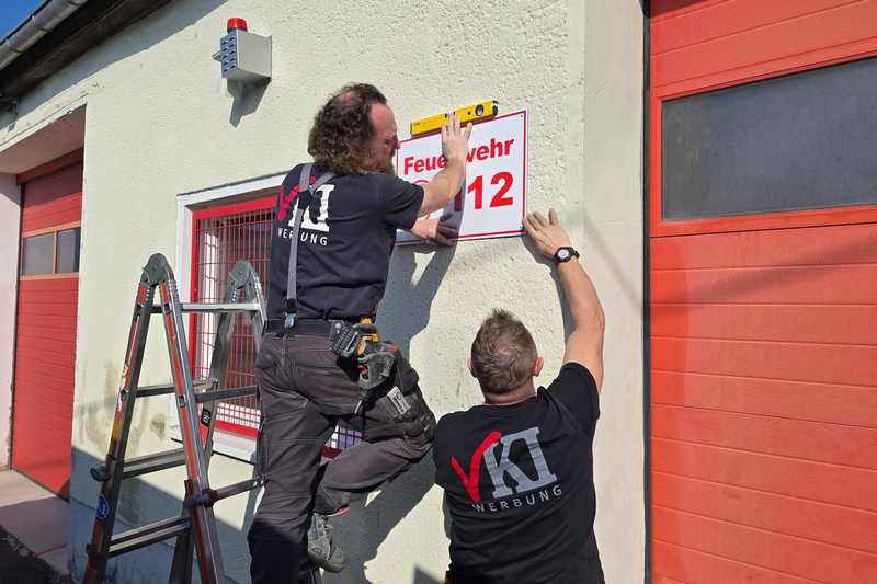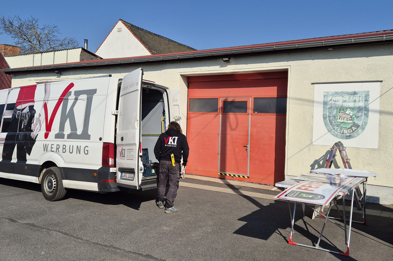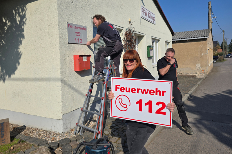 Die von VKI Werbung eingebrachten Ideen und Entwürfe hatte der Förderverein zuvor mit Parthensteins Bürgermeister abgestimmt und in den Ortsfeuerwehr-Ausschuss eingebracht. Heute Vormittag kam Isabel schließlich gemeinsam mit ihren Mitarbeitern Ronny und Steffen nach Klinga. Gemeinsam entfernten sie die alte Beschilderung und montierten die neue, die dem Klingaer Feuerwehr-Gerätehaus jetzt frischen Glanz verschafft.