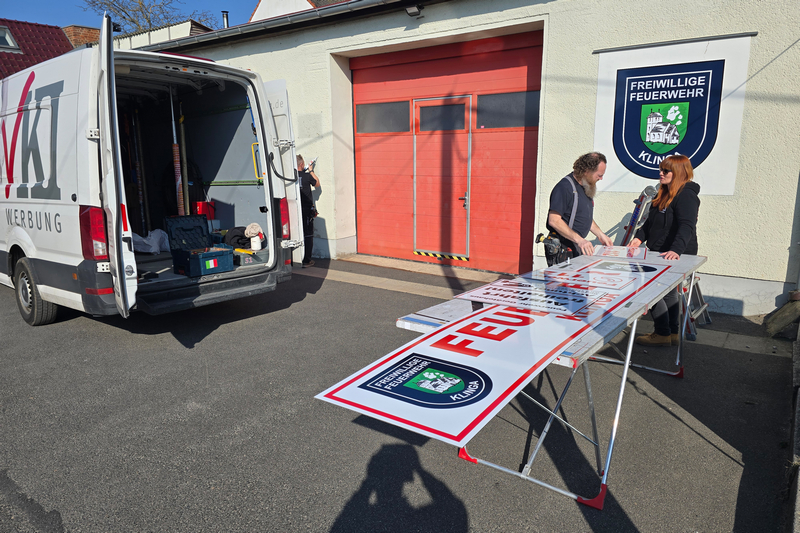 Isabel Wudke ist nicht nur langjähriges Mitglied des Klingaer Fördervereins, sondern zugleich auch Geschäftsführerin der VKI Werbung GmbH in Leipzig. Beides zusammen brachte sie Ende letzten Jahres auf die Idee, die in die Jahre gekommene, nicht mehr ansehnliche Beschilderung rund um das Klingaer Gerätehaus neu zu gestalten und auszutauschen. Heute setzte sie dieses Vorhaben als Sponsoring-Aktion um.