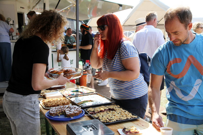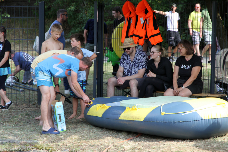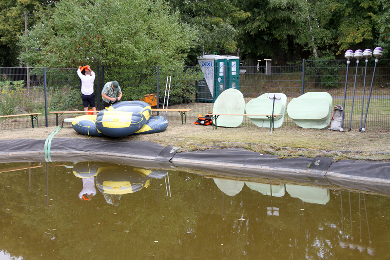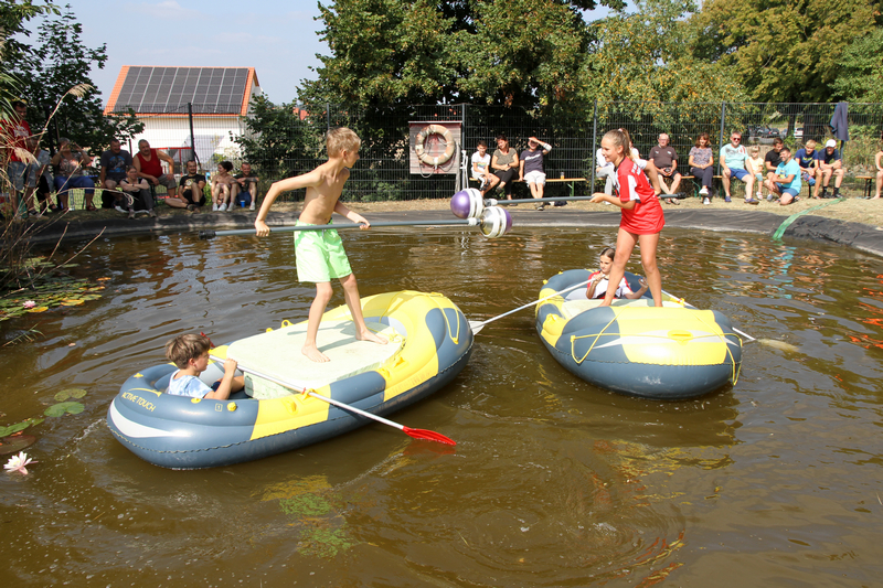 Für eine erste Stärkung sorgten zahlreiche selbstgebackene Kuchen, Eis, Zuckerwatte und Kaffee am üppig ausgestatteten Kuchenbüffet. Danach startete auch schon das 19. Klingaer Fischerstechen, zu dem dieses Jahr zwölf Teams in drei Wertungsklassen antraten. Professionell moderiert vom Schiri-Trio hatten unsere Zuschauer für ihre Ohren und Augen reichlich Spaß. Die teilweise kostümierten Wettkampf-Duos in den wackeligen Schlauchbooten zeigten Kampfgeist, und „Fishermen’s Friends“ sorgten gar für einen Überraschungserfolg gegen die traditionellen Favoriten. Am Ende blieb jedenfalls kein T-Shirt trocken – unfreiwillig oder freiwillig sprang jeder in die Fluten des Löschteichs.