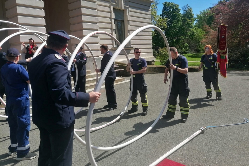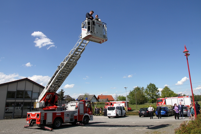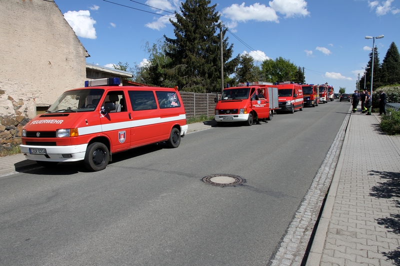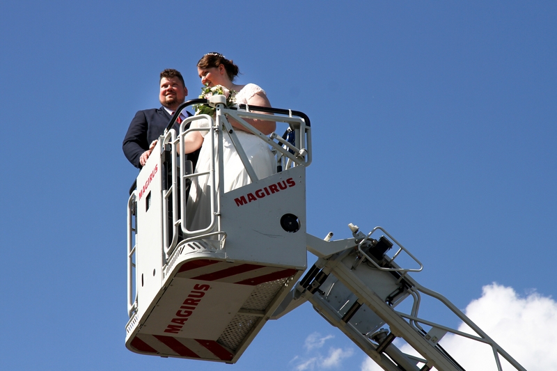 Gab am letzten Sonnabend Stephan Pohl seiner Emma das Ja-Wort, war es heute Michael Tag, der mit seiner Marie den Bund der Ehe schloss. Natürlich ließen es sich die Feuerwehrleute nicht nehmen, diesen bedeutsamen Schritt gebührend zu begleiten. So wurde Marie und Michael heute nicht nur mit der Feuerwehr nach Markkleeberg gefahren, sondern anschließend auch am Klingaer Dorfgemeinschaftszentrum standesgemäß begrüßt. Dazu waren Naunhofer und Parthensteiner Feuerwehren mit ihren Einsatzfahrzeugen gekommen. Zum Auftakt ging es mit der Drehleiter für die frisch Vermählten auf „Wolke sieben“, bevor sie mit der Kübelspritze ihr Können im Löscheinsatz bewiesen. Wir wünsche unseren jungen Ehepaaren alles Gute und viel Glück auf dem gemeinsamen Weg!
