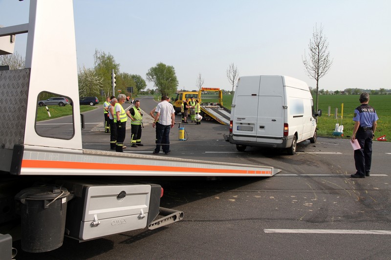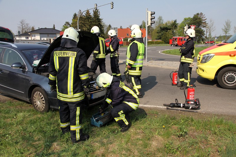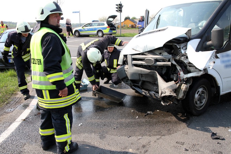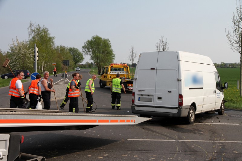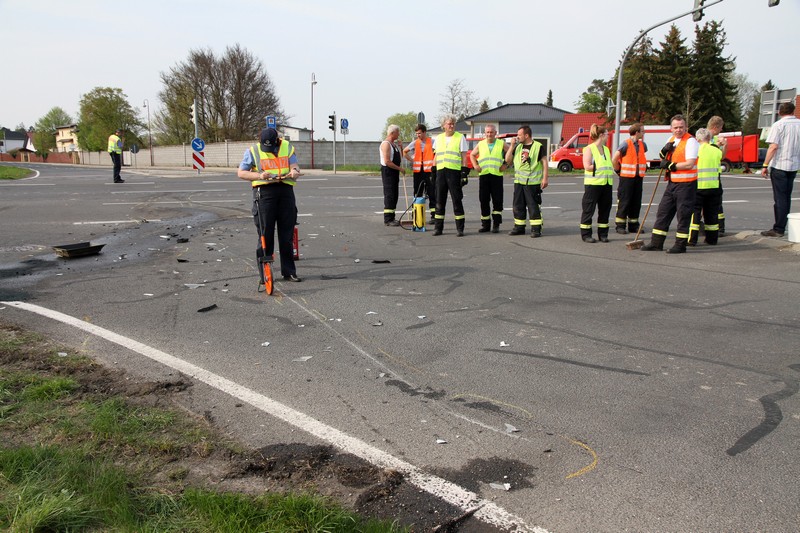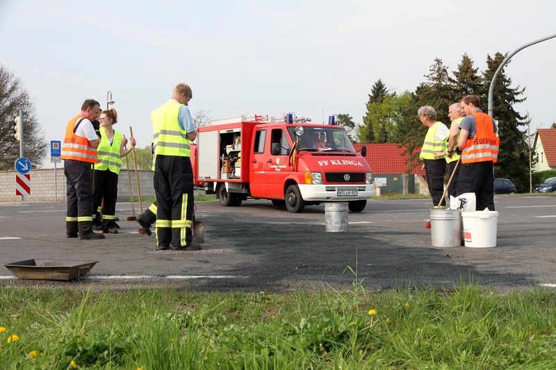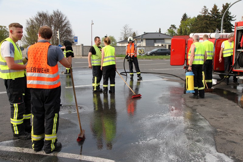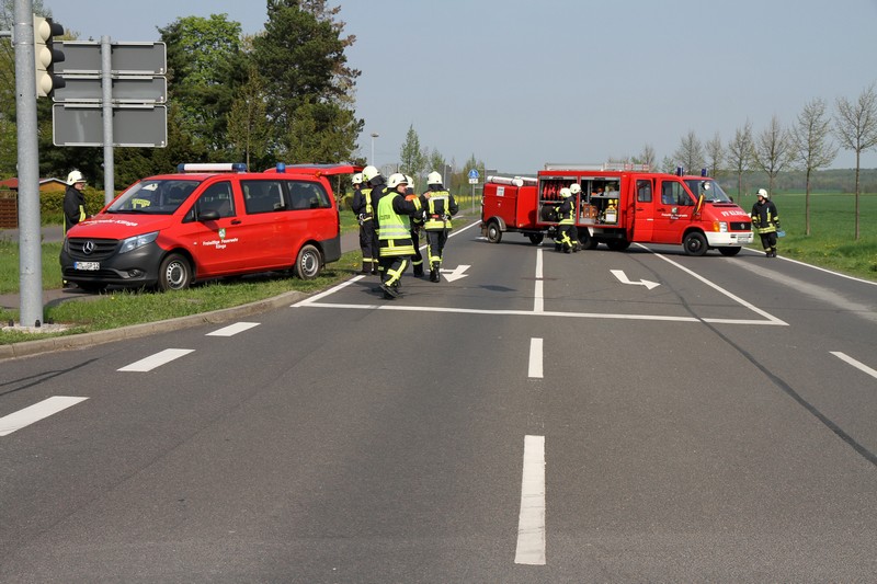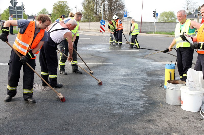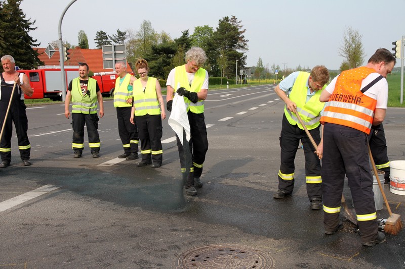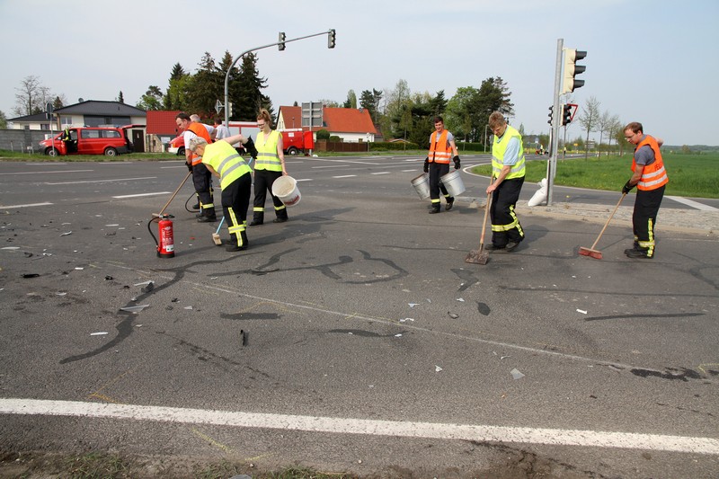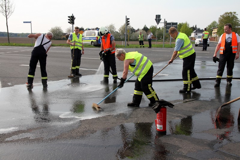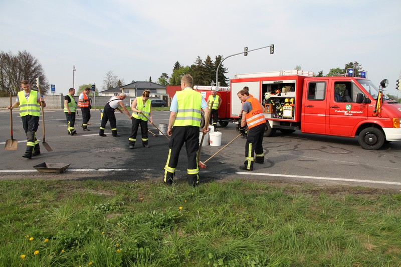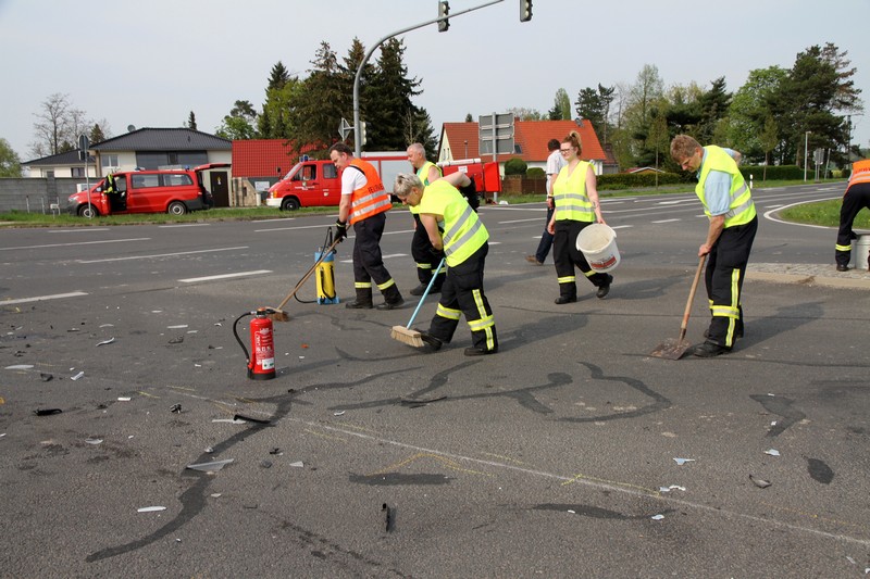Um 15.10 Uhr alarmierte die Leitstelle die Ortsfeuerwehren wegen ausgelaufener Betriebsstoffe nach einem Verkehrsunfall. Auf der Kreuzung am Großsteinberger See waren ein Transporter und ein Pkw kollidiert. Bei Eintreffen der Feuerwehrleute befanden sich Polizei und Rettungskräfte bereits vor Ort. Nach Erkundung der Lage unterstützten die Feuerwehrleute die Polizei bei der Absicherung des Unfallsorts und die Rettungskräfte beim Transport eines der Verletzten. Weiter auslaufende Betriebsstoffe wurden aufgefangen, die Fahrzeuge stromlos gemacht und die Löschbereitschaft hergestellt. Nach dem Abtransport der Verletzten, der Unfallaufnahme und dem Verladen der Unfallfahrzeuge wurde die Einsatzstelle von Fahrzeugteilen bereinigt sowie ausgelaufene Betriebsstoffe gebunden, aufgenommen und die Fahrbahn gereinigt.