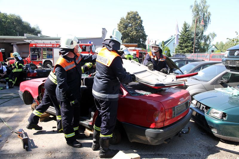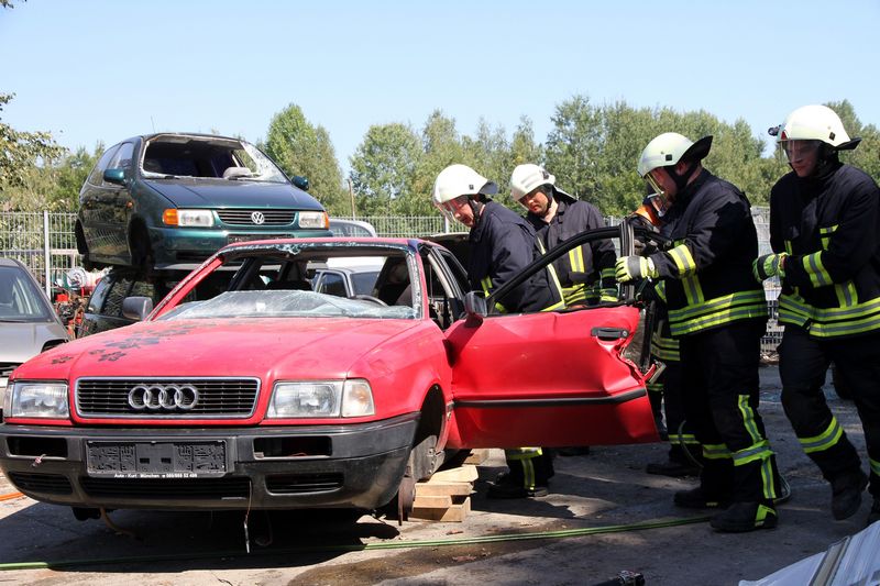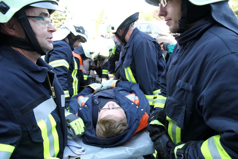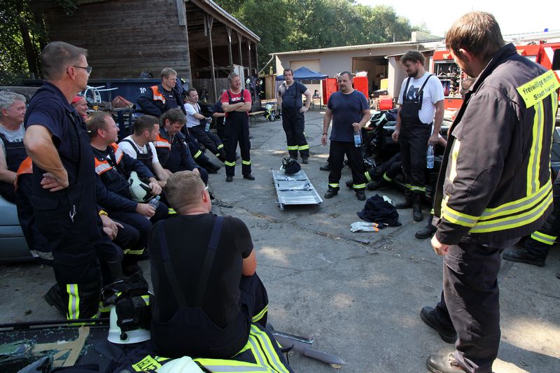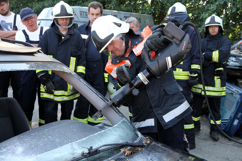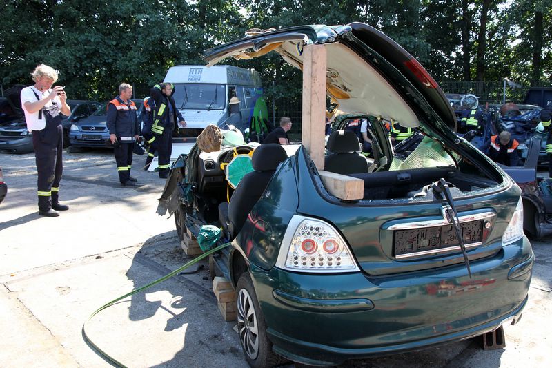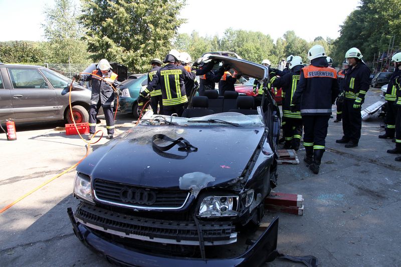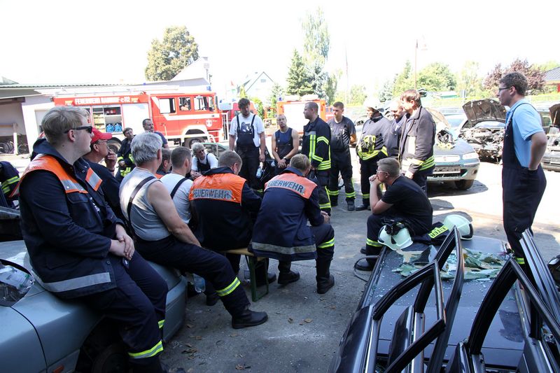 Zum Thema „Technische Hilfeleistung mit hydraulischen Rettungsgeräten und patientengerechte Rettung“ trafen sich die Klingaer Einsatzkräfte gemeinsam mit Naunhofer Feuerwehrleuten auf dem Betriebsgelände der Ammelshainer Firma Kadyk & Kadyk Abschlepp- und Bergedienst. Die Firma stellte vier Fahrzeuge zur Verfügung, an denen die Feuerwehrleute unter Anleitung der Naunhofer Ausbilder Ulf Kendschek und Lars Schuhmann taktische Themen und den Einsatz der in den Feuerwehren vorhandenen Technik trainierten. Im Mittelpunkt standen die Rettung verunfallter Personen aus Pkw unter Sicherung der Unfallfahrzeuge. Vom Glasmanagement über das Halligan Rescue Tool bis zum neuen Klingaer Schere-Spreizer-Kombigerät wurden alle Möglichkeiten erprobt und zugleich auch Grenzen der Hilfsmittel erkannt.