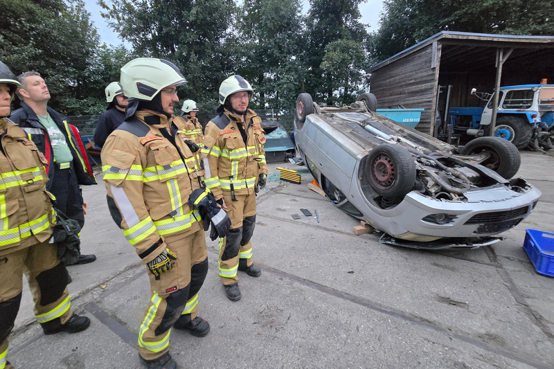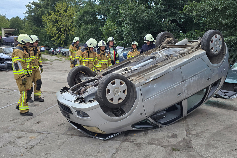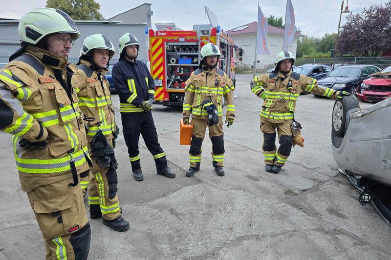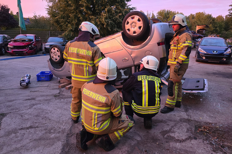 Die Firma Kadyk & Kadyk hatte auf ihrem Ammelshainer Betriebsgelände ein Schrottfahrzeug zur Verfügung gestellt, an dem die Klingaer Feuerwehrleute verschiedene Sicherungstechniken mit den ihnen zur Verfügung stehenden Mitteln trainieren konnten.