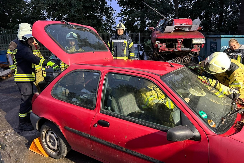 Für das Training wurde ein Pkw-Unfall mit einer eingeklemmten Person angekommen, die Verletzungen an Wirbelsäule, Kopf und Becken aufwies. Wir bedanken uns bei der Firma Kadyk & Kadyk in Ammelshain für die Unterstützung unserer Feuerwehren!
